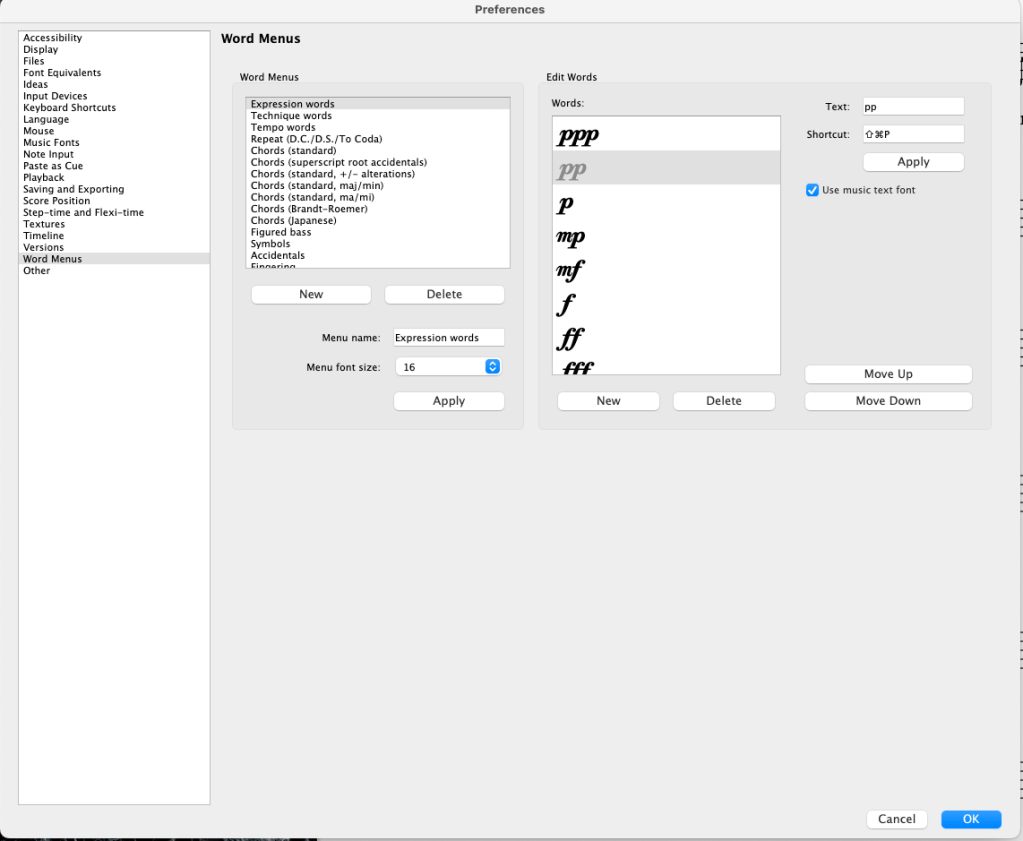 When you’re entering text, Word Menus give you a host of options underneath your right-click. For example, while entering dynamics (Expression text), a right-click gives you a drop down of lots of possible dynamic markings for easy access. But you can also assign keyboard shortcuts to these, and they appear alongside their listing in the right-click menu. Many people know that Cmd+F gives you forte when entering Expression text, and Cmd+P, piano. But there are a host of other options, and for items you use regularly, you can assign keyboard shortcuts. Again, you have to be entering Expression text to access these keyboard shortcuts, otherwise they might fire off a different command in Sibelius; the same keyboard shortcut, in other words, could be used by multiple items across different Word Menus, and by some other command within Sibelius. As long as you’re in text-entry mode, the shortcut will respect that Word Menu’s shortcuts as you’ve assigned them. Just go to the Word Menus preference pane, find the correct menu and the item you want to assign a keyboard shortcut to, and enter it in that field. Here, I’ve made pianissimo to be Cmd+Shift+P. If I wanted, I could make ppp to be Cmd+Shift+Alt+P. I could do the same with ff and fff.